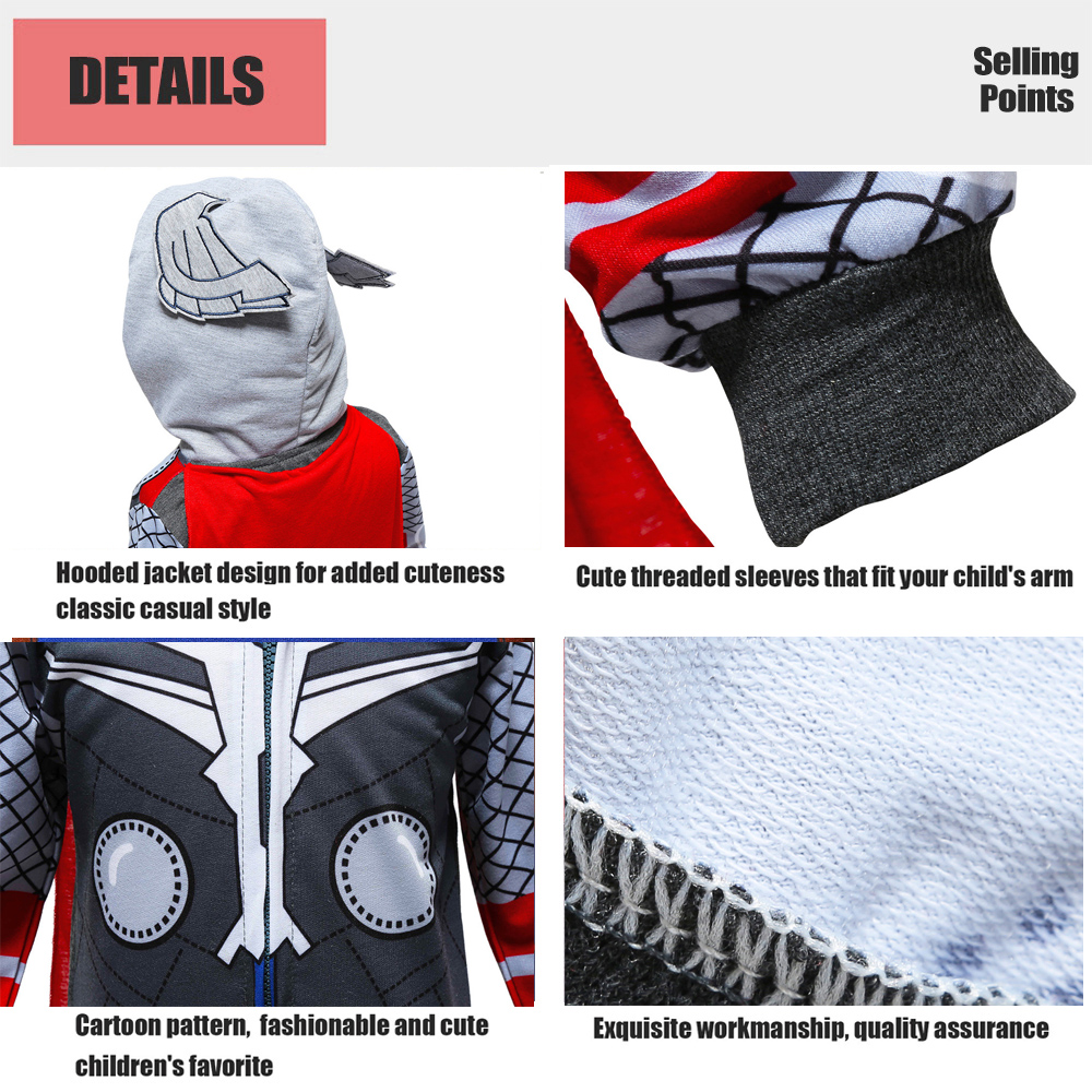 Material: Cotton Pattern: Marvel Superhero Thor Fit for: 1 to 8 years old kid Size: 100-150 Sleeve: Long Sleeve Package Included: 1*Kid Jacket