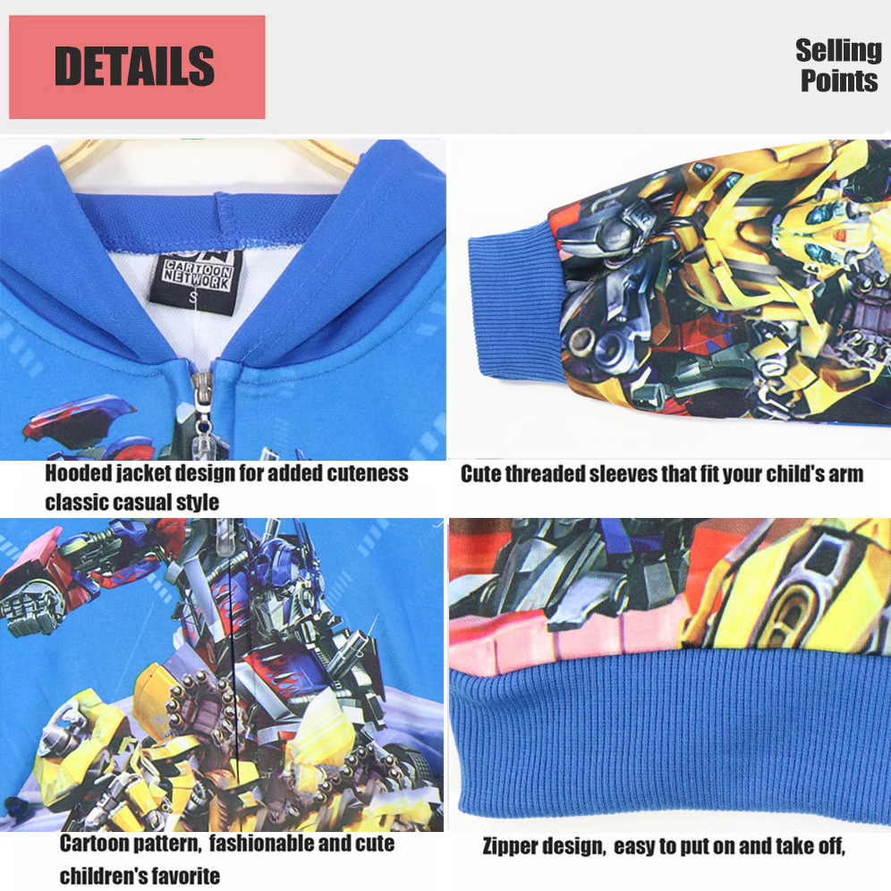 Material: Cotton Pattern: Transformers Fit for: 2 to 8 years old kid Size: S M L XL Sleeve: Long Sleeve Package Included: 1*Kid Jacket